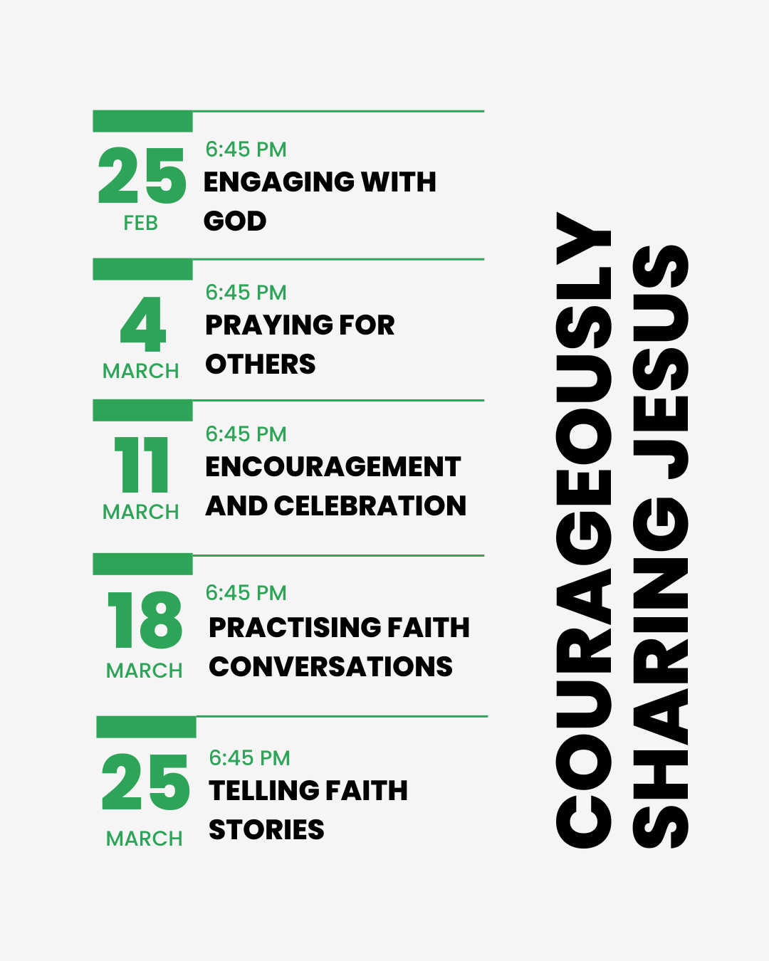 This Lent we will be joining together for five weeks beginning on Wednesday 25th February (continuing on the 4th, 11th, 18th and 25th March) and learning together how we can grow in 'Courageously Sharing Jesus'. We'll start with a light supper at 6:45pm each week, followed by a short time of worship and then learning together. Join us at 7:30pm if you'd rather join in after food. No need to sign up - just come and join us!