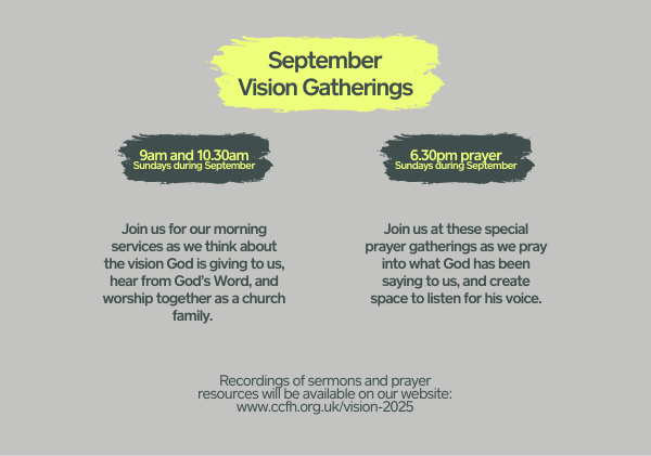 God has been giving us a new vision as a church. Through prayer, through listening, and through the guidance of the Spirit, God has been telling us what sort of church he wants us to be. This September we will hear that vision as a church family, and we will all be asked to consider how we can play our part.